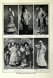 After Bizet's death, many of his manuscripts were lost; works were revised by other hands and published in these unauthorised versions so that it is often difficult to establish what is authentic Bizet.[11] Even Carmen was altered into grand opera format by the replacement of its dialogue with recitatives written by Guiraud, and by other amendments to the score.[129] The music world did not immediately acknowledge Bizet as a master and, apart from Carmen and the L'Arlésienne suite, few of his works were performed in the years immediately following his death.[11] However, the 20th century saw increased interest. Don Procopio was revived in Monte Carlo in 1906;[130] an Italian version of Les pêcheurs de perles was performed at the Metropolitan Opera in New York on 13 November 1916, with Caruso in the leading tenor role,[131] and it has since become a staple at many opera houses.[132] After its first performance in Switzerland in 1935, the Symphony in C entered the concert repertory and has been recorded by, among many others, Sir Thomas Beecham.[133] Excerpts from La coupe du roi de Thulé, edited by Winton Dean, were broadcast by the BBC on 12 July 1955,[134] and Le docteur Miracle was revived in London on 8 December 1957 by the Park Lane Group.[130] Vasco da Gama and Ivan IV have been recorded, as have numerous songs and the complete piano music.[n 11] Carmen, after its lukewarm initial Paris run of 45 performances, became a worldwide popular success after performances in Vienna (1875) and London (1878).[138] It has been hailed as the first opera of the verismo school, in which sordid and brutal subjects are emphasised, with art reflecting life—"not idealised life but life as actually lived".[127][139]