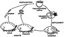 Black abalone reach sexual maturity at 3 years and can live 30 years or more.[6][9] Spawning occurs in spring and early summer; occasionally, a second spawn occurs in the fall.[9] Black abalone are broadcast spawners, and successful spawning requires that individuals be grouped closely together. Larvae are free-swimming for between 5 and 14 days before they settle onto hard substrate, usually near larger individuals,[9] where they then metamorphose into their adult form, develop a shell and settle onto a rock.[1] Juveniles do not tend to disperse great distances, and current populations of black abalone are generally composed of individuals that were spawned locally. Juveniles settle in crevices and remain hidden until they reach approximately 4 inches in length. At that point, adults congregate in more exposed areas such as rocks and in tide pools.[9] They are thought to be able to live for between 25 and 75 years, and will begin to reproduce between three and seven years.[1]