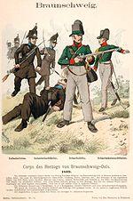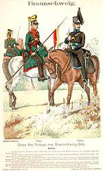 A single infantry regiment and the hussars were maintained by the Duchy of Brunswick after the end of the Napoleonic War. In 1830, the uniform colour was changed to blue, but reverted to black in 1850.[32] The Brunswick units were integrated into the Prussian Army in 1866 with the titles: Braunschweigisches Infanterie-Regiment Nr.92 and Braunschweigisches Husaren Regiment Nr.17 following the Prussian regimental numbering sequence. Both units kept the skulls with the crossed bones on their helmets and caps and carried the battle honours "Peninsula-Sicily-Waterloo" until the end of World War I in 1918, when they were disbanded.[33] At that time, a collection of artefacts and uniforms from the Napoleonic era were presented by the officers of the corps to the Braunschweigisches Landesmuseum, where they remain.[34]