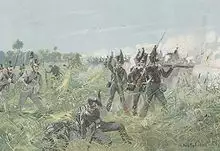 Colonel Elias Olfermann was the Duke's adjutant general, who assumed immediate command of the corps.[14] Wellington then ordered the Brunswick hussars to make an unsupported counterattack on the French light cavalry brigade, but they were driven off by heavy fire. Later in the battle, French cuirassiers broke the allied front line and were only prevented from taking the crossroads by the Brunswick infantry who had formed themselves into squares. By 21:00, allied reinforcements, including the newly arrived Brunswick 1st and 3rd light regiments, had driven the French back to their starting positions.[15] Brunswick losses that day amounted to 188 killed and 396 wounded.[16]