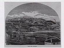 According to Federation University's Ballarat and District Industrial Heritage Project, Black Hill was known by the local Watha Warrung as 'Bowdun', which was the original name given by the surveyor William Urquart in 1851.[3] The subtitle 'Black Hill' was given by Urquart in reference to the dense canopy of trees.[4][5][6] However, extensive mining over the 1850s saw the hill stripped of trees and significantly reduced in height, as well as the creation of a valley.[7] It became a focal point for quartz causing operations at this time, with the erection of a crushing battery at the base of the hill, probably the first in Australia.[3] As late as 1856 this is evidence that Indigenous peoples lived amongst miners at Black Hill, with some oral history accounts of child minding during the Eureka Rebellion.[8]