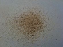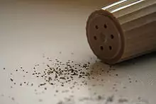 Pepper gets its spicy heat mostly from piperine derived from both the outer fruit and the seed. Black pepper contains between 4.6 and 9.7% piperine by mass, and white pepper slightly more than that.[49] Refined piperine, by weight, is about one percent as hot as the capsaicin found in chili peppers.[50] The outer fruit layer, left on black pepper, also contains aroma-contributing terpenes, including germacrene (11%), limonene (10%), pinene (10%), alpha-phellandrene (9%), and beta-caryophyllene (7%),[51] which give citrusy, woody, and floral notes. These scents are mostly missing in white pepper, as the fermentation and other processing removes the fruit layer (which also contains some of the spicy piperine). Other flavours also commonly develop in this process, some of which are described as off-flavours when in excess: Primarily 3-methylindole (pig manure-like), 4-methylphenol (horse manure), 3-methylphenol (phenolic), and butyric acid (cheese).[52] The aroma of pepper is attributed to rotundone (3,4,5,6,7,8-Hexahydro-3α,8α-dimethyl-5α-(1-methylethenyl)azulene-1(2H)-one), a sesquiterpene originally discovered in the tubers of Cyperus rotundus, which can be detected in concentrations of 0.4 nanograms/l in water and in wine: rotundone is also present in marjoram, oregano, rosemary, basil, thyme, and geranium, as well as in some Shiraz wines.[53]
