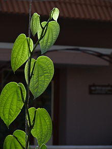 The pepper plant is a perennial woody vine growing up to 4 m (13 ft) in height on supporting trees, poles, or trellises. It is a spreading vine, rooting readily where trailing stems touch the ground. The leaves are alternate, entire, 5 to 10 cm (2.0 to 3.9 in) long and 3 to 6 cm (1.2 to 2.4 in) across. The flowers are small, produced on pendulous spikes 4 to 8 cm (1.6 to 3.1 in) long at the leaf nodes, the spikes lengthening up to 7 to 15 cm (2.8 to 5.9 in) as the fruit matures.[9] Pepper can be grown in soil that is neither too dry nor susceptible to flooding, moist, well-drained and rich in organic matter (the vines do not do too well over an altitude of 900 m (3,000 ft) above sea level). The plants are propagated by cuttings about 40 to 50 cm (16 to 20 in) long, tied up to neighbouring trees or climbing frames at distances of about 2 m (6 ft 7 in) apart; trees with rough bark are favoured over those with smooth bark, as the pepper plants climb rough bark more readily. Competing plants are cleared away, leaving only sufficient trees to provide shade and permit free ventilation. The roots are covered in leaf mulch and manure, and the shoots are trimmed twice a year. On dry soils, the young plants require watering every other day during the dry season for the first three years. The plants bear fruit from the fourth or fifth year, and then typically for seven years. The cuttings are usually cultivars, selected both for yield and quality of fruit.