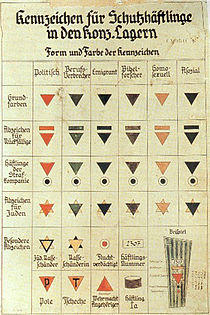 The black triangle was a badge used in Nazi concentration camps to mark prisoners regarded asozial ("anti-social") and arbeitsscheu ("work-shy"). Those considered anti-social included primarily the Romani but it was also used until 1942 to describe alcoholics, homeless, beggars, nomads, and prostitutes.[1] Women deemed to be anti-social included sex-workers, nonconformists, and lesbians.[2] The term "asocial" was originally applied to heterosexual women who engaged in sex outside of marriage, which included prostitutes.