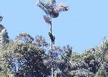 They are known to prey on woolly monkeys, possibly other monkeys including capuchins, porcupines, coatis, squirrels and other small-to-mid-sized arboreal mammals.[13] Large birds such as guans are also seemingly often taken. They frequently have much abraded tails by plunging after prey through the branches. They overlap in range with several other large forest eagles, including other Spizaetus eagles, but few interactions have been reported and, as they often occur at slightly different altitudes than other neotropic forest eagles, the black-and-chestnut eagle is believed to be normally the top avian predator in its range. One exception is the similarly sized solitary eagle, which preliminary reports suggests mostly hunts snakes, whereas the black-and-chestnut eagle seems to prefer birds and small-to-mid-sized mammals, and the two species were observed flying near each other without aggression in southeastern Peru since prey partitioning appears to allow them to co-exist.[14] One species seen to be aggressively displaced by the black-and-chestnut eagles here was the turkey vulture, possibly because they sometimes steal eggs from bird's nests.[14] Black-and-chestnut eagles sometimes hunt chickens, including standard-sized adults, which has caused some persecution of this endangered species. One small dietary study was conducted in Colombia, however, found that chickens made up 14.7% while wild Andean guans were much more frequently taken, making up 53.9% of the diet. Also, here the black-and-chestnut eagles took about the same number of western mountain coatis as they did chickens, and coatis are known predators of poultry chicks and eggs.[15][16]
