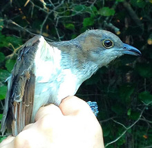 Adults have a long, graduated brown tail and a black, slightly downcurved bill. The head and upper parts are brown and the underparts are white. The feet are zygodactylous. Juveniles are drabber and may contain some rufous coloration on the wing. The adults have a narrow, red orbital ring while the juveniles' is yellow.[7] Black-billed cuckoo chicks have white, sparsely-distributed, sheath-like down that contrasts heavily with their black skin. They also have complex, creamy-colored structures on their mouth and tongue, which may appear like warts or some type of parasitic infection however they are normal for the species.[8]