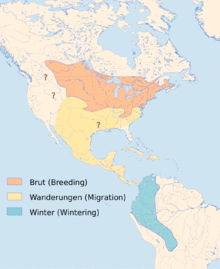 When breeding, the species is distributed in wooded areas across much of the United States, east of the Rockies. Their range just barely extends into North Carolina, Arkansas, Oklahoma and Tennessee. They are not present to the south of those states when breeding. They can also be found in southern regions of Alberta, Saskatchewan, Manitoba, Ontario and Quebec. They're also present in the maritime provinces of Prince Edward Island, eastern New Brunswick and western Nova Scotia. When migrating in spring and fall, they can also be seen in southern United States as well as all of Central America. They migrate to northwestern South America in the fall, where they will spend the winter.[9] Although they are mainly an eastern North American species, there have been confirmed reports of them in British Columbia, Washington and California.[10] The species is also a rare vagrant to western Europe and Greenland.[11][12][13]