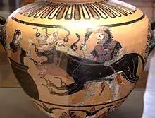 Starting around the second third of the 6th century BC, Attic artists became interested in mythological scenes and other representations of figures. Animal friezes became less important. Only a few painters took care with them, and they were generally moved from the center of attention to less important areas of vases. This new style is especially represented by the François vase, signed by both the potter Ergotimos and the painter Kleitias (570–560 BC). This krater is considered to be the most famous Greek painted vase.[22] It is the first known volute krater made of clay. Mythological events are depicted in several friezes, with animal friezes being shown in secondary locations. Several iconographic and technical details appear on this vase for the first time. Many are unique, such as the representation of a lowered mast of a sailing ship; others became part of the standard repertoire, such as people sitting with one leg behind the other, instead of with the traditional parallel positioning of the legs.[23] Four other, smaller vases were signed by Ergotimos and Kleitias, and additional vases and fragments are attributed to them. They provide evidence for other innovations by Kleitias, like the first depiction of the birth of Athena or of the Dance on Crete.