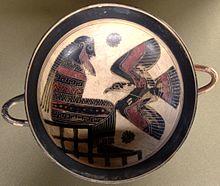- ^ On Lakonian pottery see Matthias Steinhart: Lakonische Vasenmalerei. In: Der Neue Pauly (DNP). Band 6, Metzler, Stuttgart 1999, ISBN 3-476-01476-2, Sp. 1074–1075.; Thomas Mannack: Griechische Vasenmalerei, Theiss, Stuttgart 2002, S. 125–128; Conrad M. Stibbe: Das andere Sparta, von Zabern, Mainz 1996, S. 163–203; John Boardman: Early Greek Vase Painting, Thames and Hudson, London 1998, pp. 185–188