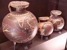 Samian pottery first appeared around 560/550 BC with forms adopted from Attica. These are Little Masters cups and kantharos with facial forms. The painting is precise and decorative. Samos along with Milet and Rhodes was one of the main centers for the production of vases in the Wild Goat style.[66]