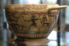 In the meantime at least eight vase painters can be distinguished. Five painters, the Arkesilas Painter (565–555), the Boreads Painter (575–565), the Hunt Painter, the Naucratis Painter (575–550) and the Rider Painter (550–530) are considered to be the more important representatives of the style, while other painters are regarded as craftsmen of lesser ability. The images are usually angular and stiff, and contain animal friezes, scenes of daily life, especially symposia, and many mythological subjects. Of the latter, Poseidon and Zeus are depicted especially frequently, but also Heracles and his twelve labors as well as the Theban and Trojan legend cycles. Especially on the early vases, a gorgon grimace is placed in a cup tondo. A depiction of the nymph Cyrene and a tondo with a rider with a scrolling tendril growing from his head (name vase of the Rider Painter) are exceptional.[58] Also important is a cup with an image of Arcesilaus II. The Arcesilas cup supplied the pragmatic name for the Arcesilas Painter.[59] It is one of the rare depictions on Greek pottery of current events or people. The subjects suggest Attic influence. A reddish purple was the main opaque color. At present over 360 Laconian vases are known, with almost a third of them, 116 pieces, being attributed to the Naucratis Painter. The decline around 550 BC of Corinthian black-figure vase painting, which had an important influence on Laconian painting, led to a massive reduction in the Laconian production of black-figure vases, which came to an end around 500 BC. The pottery was very widely distributed, from Marseille to Ionian Greece. On Samos, Laconian pottery is more common than Corinthian pottery because of the close political alliance with Sparta.[60]