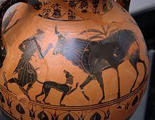 The last outstanding painter of the Pre-Classical Archaic Period was Lydos (560-540 BC), who signed two of his surviving pieces with ho Lydos (the Lydian). He or his immediate ancestors probably came from Asia Minor but he was undoubtedly trained in Athens. Over 130 surviving vases are now attributed to him. One of his pictures on a hydria is the first known Attic representation of the fight between Heracles and Geryon. Lydos was the first to show Heracles with the hide of a lion, which afterward became common in Attic art. He also depicted the battle between the gods and the giants on a dinos found on Athens’ acropolis, and Heracles with Cycnus. Lydos decorated other types of vessels besides hydriai and dinos, such as plates, cups (overlap Siena cups), column kraters and psykters, as well as votive tablets. It continues to be difficult to identify Lydos’ products as such since they frequently differ only slightly from those of his immediate milieu. The style is quite homogenous, but the pieces vary considerably in quality. The drawings are not always carefully produced. Lydos was probably a foreman in a very productive workshop in Athens’pottery district. He was presumably the last Attic vase painter to put animal friezes on large vases. Still in the Corinthian tradition, his figure drawings are a link in the chain of vase painters extending from Kleitias via Lydos and the Amasis Painters to Exekias. Along with them he participated in the evolution of this art in Attica and had a lasting influence.[25]