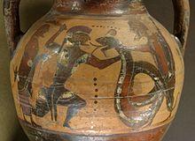 Black-figure vase painting in Euboea was also influenced by Corinth and especially by Attica. It is not always easy to distinguish these works from Attic vases. Scholars assume that most of the pottery was produced in Eretria. Primarily amphoras, lekythos, hydria and plates were painted. Large-format amphoras were usually decorated with mythological scenes, such as the adventures of Herakles or the Judgment of Paris. The large amphoras, derived from 7th century shapes, have tapering lips and usually scenes relating to weddings. They are apparently funerary vases produced for children who died before they could marry. Restrained employment of incising and regular use of opaque white for the floral ornaments were typical features of black-figure pottery from Eretria. In addition to scenes reflecting Attic models, there were also wilder scenes like the rape of a deer by a satyr or Heracles with centaurs and demons. The vases of the Dolphin Class were previously regarded as being Attic, but are now considered to be Euboic. However, their clay does not match any known Eretrian sources. Perhaps the pieces were produced in Chalcis.[63]