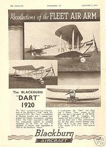 The Blackburn Dart was a British carrier-based torpedo bomber biplane, manufactured by Blackburn Aircraft, which first flew in 1921. The Dart was the standard single-seat torpedo bomber used by the Fleet Air Arm from 1923 until 1933. A modified variant was also sold to Greece, where they served with the Greek Navy.