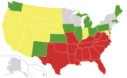 - ^ Arkansas, Florida, Louisiana, Mississippi, Texas, South Carolina and Alabama repealed their laws during the Reconstruction period, but the laws were later reinstated and remained in force until 1967.