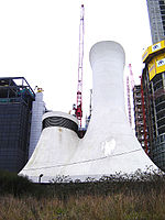 The new eastern tunnel, 8.59 metres (28 ft 2 in) in diameter, was accepted into the roads programme in March 1959, and construction started in March 1960.[19] It was opened on 2 August 1967 by Desmond Plummer, Leader of the Greater London Council (GLC).[20] It is wider than the western tunnel, carries two lanes of traffic and is usable by vehicles up to 4.72 m (15.5 ft) in height. During construction, transport minister Ernest Marples clarified that unlike the Dartford Tunnel, also then under construction, tolls would not be imposed as the tunnel was already an established route.[21] At the time of opening, the strip lighting in the tunnel was commended as "a big improvement"[20] on the standard provided in the original tunnel. In contrast with the Victorian northbound tunnel, the eastern tunnel had no sharp bends, and emergency telephones were provided. Its distinctive ventilation towers were designed in 1964 by GLC architect Terry Farrell.[8][13] Immediately after opening, the old tunnel was closed for refurbishment. It re-opened on 4 April 1969 with a new electronic system to detect overheight vehicles.[6]