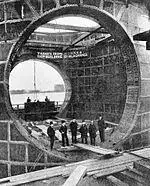 A tunnel in the Blackwall area was originally proposed in the 1880s. According to Robert Webster, then MP for St Pancras East, a tunnel would "be very useful to the East End of London, a district representing in trade and commerce a population greater than the combined populations of Liverpool, Manchester and Birmingham."[5] By this time, all road bridges in London east of the ferry at Chiswick were toll-free, but these were of little use to the two fifths of London's population that lived to the east of London Bridge. The Thames Tunnel (Blackwall) Act was created in August 1887, which provided the legal framework necessary to construct the tunnel.[5][6] The initial proposal, made by Sir Joseph Bazalgette, called for three parallel tunnels, two for vehicular traffic and one for foot,[7] with an expected completion date of works within seven years. It was originally commissioned by the Metropolitan Board of Works but, just before the contract was due to start, responsibility passed to the London County Council (LCC) when the former body was abolished in 1889 and Bazalgette's work on the tunnel ended.[8]