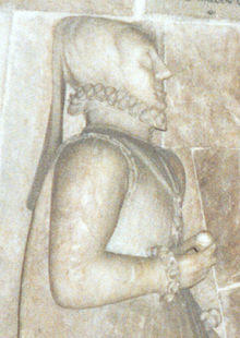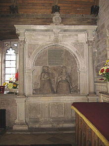 Her marble and alabaster mural monument survives on the south west wall of St Margaret's Church, Westminster, although this was not its original position, having been moved several times.[2] It was formerly on the south side of the chancel;[2] George Ballard saw her tomb in its original location in 1752.[10] It shows a relief-sculpted and painted effigy of Parry kneeling towards the left at a prayer desk, with hands now missing. Above are displayed in a lozenge (appropriate for a female armiger) her paternal arms of eight quarters. Payment for the monument is recorded as having been made by Mr Powell, her executor, in 1595/6. The inscription is as follows (note her executors named her father incorrectly: he used Welsh nomenclature):