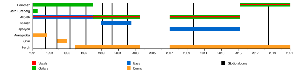 - Abbath Doom Occulta (Olve Eikemo) – vocals (1991–2015), guitars (1998–2015), bass (1991–1998), studio drums (1993–1995)