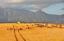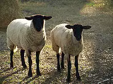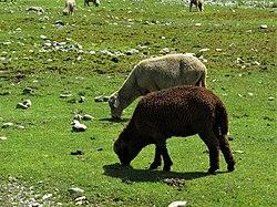 The domestic sheep is a multi-purpose animal, and the more than 200 breeds now in existence were created to serve these diverse purposes.[16][34] Some sources give a count of a thousand or more breeds,[35][36] but these numbers cannot be verified, according to some sources.[22][28] However, several hundred breeds of sheep have been identified by the Food and Agriculture Organization of the UN (FAO), with the estimated number varying somewhat from time to time: e.g. 863 breeds as of 1993,[37] 1314 breeds as of 1995[38] and 1229 breeds as of 2006.[39] (These numbers exclude extinct breeds, which are also tallied by the FAO.) For the purpose of such tallies, the FAO definition of a breed is "either a subspecific group of domestic livestock with definable and identifiable external characteristics that enable it to be separated by visual appraisal from other similarly defined groups within the same species or a group for which geographical and/or cultural separation from phenotypically similar groups has led to acceptance of its separate identity."[39] Almost all sheep are classified as being best suited to furnishing a certain product: wool, meat, milk, hides, or a combination in a dual-purpose breed. Other features used when classifying sheep include face color (generally white or black), tail length, presence or lack of horns, and the topography for which the breed has been developed. This last point is especially stressed in the UK, where breeds are described as either upland (hill or mountain) or lowland breeds.[32] A sheep may also be of a fat-tailed type, which is a dual-purpose sheep common in Africa and Asia with larger deposits of fat within and around its tail.