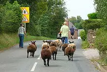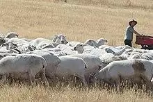 Farmers exploit flocking behavior to keep sheep together on unfenced pastures such as hill farming, and to move them more easily. For this purpose shepherds may use herding dogs in this effort, with a highly bred herding ability. Sheep are food-oriented, and association of humans with regular feeding often results in sheep soliciting people for food.[60] Those who are moving sheep may exploit this behavior by leading sheep with buckets of feed.[61][62]