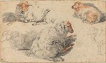 The exact line of descent between domestic sheep and their wild ancestors is unclear.[2] The most common hypothesis states that Ovis aries is descended from the Asiatic (O. orientalis) species of mouflon.[3] Sheep were among the first animals to be domesticated by humankind (although the domestication of dogs may have taken place more than 20,000 years earlier); the domestication date is estimated to fall between 11,000 and 9,000 B.C in Mesopotamia[4][5][6][7] and possibly around 7,000 B.C. in Mehrgarh in the Indus Valley.[8][9] The rearing of sheep for secondary products, and the resulting breed development, began in either southwest Asia or western Europe.[10] Initially, sheep were kept solely for meat, milk and skins. Archaeological evidence from statuary found at sites in Iran suggests that selection for woolly sheep may have begun around 6000 BC,[3][11] and the earliest woven wool garments have been dated to two to three thousand years later.[12]