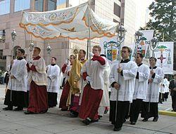 The largest Portuguese feast in the world is held in New Bedford, Massachusetts in honor of the Blessed Sacrament attracting over 100,000 visitors each year.[4][5]