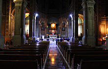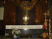 The Blessed Sacrament, also Most Blessed Sacrament, is a devotional name used in the Latin Church of the Catholic Church, as well as in Anglicanism, Lutheranism, Methodism,[1] and the Old Catholic Church, as well as in some of the Eastern Catholic Churches, to refer to the body and blood of Christ in the form of consecrated sacramental bread and wine at a celebration of the Eucharist. In the Byzantine Rite, the terms Holy Gifts and Divine Mysteries are used to refer to the consecrated elements.[2] Christians in these traditions believe in the Real Presence of Jesus Christ in the Eucharistic elements of the bread and wine and some of them, therefore, practice Eucharistic reservation and adoration. This belief is based on interpretations of both scripture and sacred tradition. The Catholic understanding has been defined by numerous ecumenical councils, including the Fourth Lateran Council and the Council of Trent, which is quoted in the Catechism of the Catholic Church (which explains the meaning of transubstantiation).[3]