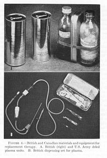 Nevertheless, the decision was made to develop a dried plasma package for the armed forces as it would reduce breakage and make the transportation, packaging, and storage much simpler.[22] The resulting dried plasma package came in two tin cans containing 400 cc bottles. One bottle contained enough distilled water to reconstitute the dried plasma contained within the other bottle. In about three minutes, the plasma would be ready to use and could stay fresh for around four hours.[23] The Blood for Britain program operated successfully for five months, with total collections of almost 15,000 people donating blood, and with over 5,500 vials of blood plasma.[24]