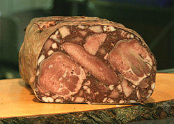 Blood Tongue, or Zungenwurst (translation tongue sausage), is a variety of German head cheese with blood. It is a large head cheese that is made with pig's blood, suet, bread crumbs and oatmeal with chunks of pickled beef tongue added. It has a slight resemblance to blood sausage. It is commonly sliced and browned in butter or bacon fat prior to consumption. It is sold in markets pre-cooked and its appearance is maroon to black in color.