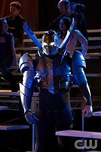 - Jaren Brandt Bartlett portrayed Jaime Reyes in the tenth season of Smallville.[50] In the episode "Booster", he is originally portrayed as a teenager living in Metropolis who is shy and somewhat-clumsy, and was bullied because of it, until the Blue Beetle scarab attached itself to him after he was nearly in a traffic accident involving a vehicle that was transporting it to a Kord Industries facility. After seeking out new hero Booster Gold in the hopes that he could help remove the scarab from his spine, the scarab transforms Jaime into the Blue Beetle, and Jaime is unable to stop the armor from making him attack Booster. After nearly strangling Booster, Jaime is able to gain control over the scarab when Booster convinces him to stand up and assert himself over the scarab, shutting it down and reverting to his normal self. Ted Kord later offers to remove the scarab, but Jaime tells him he wishes to keep it and learn how to become a hero, and Booster offers to help Jaime control his powers and convinces Lois Lane to interview Jaime. This version's battle suit is rather bulky and lacks the traditional mouth seen in the comics (as the effect is difficult to pull off in live action). The name Blue Beetle was not used in the episode. Even though this incarnation is from Metropolis, he is seen in the episode wearing a shirt reading "El Paso", a nod to his comic book roots.