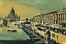 The Blue Bridge (Russian: Си́ний мост, Siniy most), is a 97.3-metre-wide (319 ft) bridge that spans the Moika River in Saint Petersburg, Russia. The Blue Bridge is the widest bridge in Saint Petersburg and is sometimes claimed to be the widest bridge in the world – a claim, however, that has not been recognized by international reference works, such as the Guinness World Records.