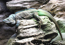 The blue iguana is the largest native land animal on Grand Cayman with a total nose-to-tail length of 5 ft (1.5 m) and weighing as much as 30 lb (14 kg).[14][15] This is among the largest species of lizard in the Western Hemisphere.[11] Its body length is 20–30 in (510–760 mm) with a tail equal in length.[16] The blue iguana's toes are articulated to be efficient in digging and climbing trees.[17] The mature male's skin color ranges from dark grey to turquoise blue, whereas the female is more olive green to pale blue. Young animals tend to be uniformly dark brown or green with faint darker banding.[16] When they first emerge from the nest the neonates have an intricate pattern of eight dark dorsal chevrons from the crest of their necks to their pelvic area. These markings fade by the time the animal is one year old, changing to mottled gray and cream and eventually giving way to blue as adults. The adult blue iguana is typically dark gray matching the karst rock of its landscape. The animal changes its color to blue when it is in the presence of other iguanas to signal and establish territory. The blue color is more pronounced in males of the species.[18] Their distinctive black feet stand in contrast to their lighter overall body color. The blue iguana's eyes have a golden iris and red sclera.[16]