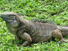 The common green iguana, (Iguana iguana), has been introduced from Honduras and is well-established on Grand Cayman as an invasive species. It far outnumbers the native blue iguana.[31][32] No direct negative consequences on the blue iguana due to this introduction are known, but the mere presence of the green iguana confuses public attitudes and understanding.[1][33] For example, the people of the island are told that blue iguanas are endangered and rare, but the green iguana look very similar and quite common in suburban areas.[33][34]