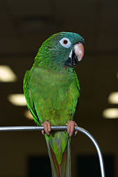 The blue-crowned parakeet, blue-crowned conure, blue-crowned budgie, or sharp-tailed conure (Thectocercus acuticaudatus) is a small green Neotropical parrot with a blue head and pale beak native to large parts of South America, from eastern Colombia in the north to northern Argentina in the south. They inhabit savanna-like habitats, woodland and forest margins, but avoid dense humid forest such as the Amazon.