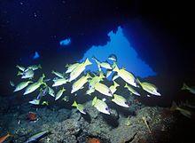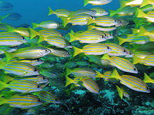 In the 1950s, investigators from the Hawaii's Division of Fish and Game conducted marine fauna surveys and found the Hawaiian ichthyofauna was dominated by herbivorous fishes, which they concluded were "a useless end in the food chain".[6] Unlike many Pacific islands, Hawaii lacked any fish from the Serranidae or Lutjanidae families, so to increase recreational and commercial food fishing opportunities, and fill a perceived 'vacant ecological niche', collections of 11 species of snappers and groupers were imported from Mexico, Kiribati, the Marquesas Islands, and Moorea, and introduced to Hawaii.[7] Only three species thrived, dominated by the bluestripe snapper, now occupying many of the Hawaiian Islands.[8]