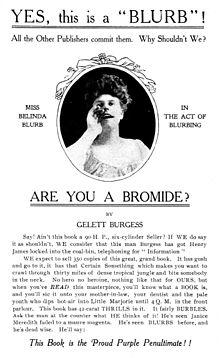 The word blurb was coined in 1907 by American humorist Gelett Burgess (1866–1951).[2] His short 1906 book Are You a Bromide? was presented in a limited edition to an annual trade association dinner. The custom at such events was to have a dust jacket promoting the work and with, as Burgess' publisher B. W. Huebsch described it, "the picture of a damsel—languishing, heroic, or coquettish—anyhow, a damsel on the jacket of every novel".