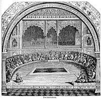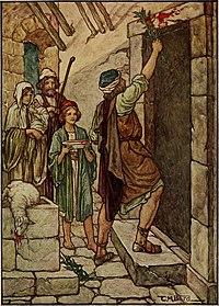In the short fifth reading, Moses instructed the elders of Israel to kill their Passover lambs, paint their doorways with the lamb's blood, and remain inside their houses until the morning.[27] For God would smite the Egyptians, but when God saw the blood on the lintel, God would pass over the house and not allow "the Destroyer" to come into that house.[28] The Israelites were to observe the Passover service for all time, and when their children would ask what the service means, they were to say that it commemorated the time when God passed over the Israelites' houses when God smote the Egyptians. ' And the people bowed the head and worshipped.[29] And the Israelites did as God commanded Moses and Aaron.[30] The fifth reading and a closed portion end here.[31]