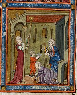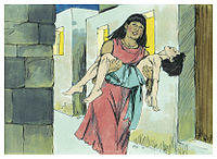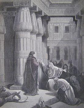 In the first reading, after seven plagues, God continued visiting plagues on Egypt. Moses and Aaron warned Pharaoh to let the Israelites go, or suffer locusts (אַרְבֶּה, arbeh) covering the land.[4] Pharaoh's courtiers pressed Pharaoh to let the men go, so Pharaoh brought Moses and Aaron back and asked them, "Who are the ones to go?"[5] Moses insisted that young and old, sons and daughters, flocks and herds would go, but Pharaoh rejected Moses' request and expelled Moses and Aaron from his presence.[6] The first reading and a closed portion end here.[7]