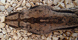 The boa constrictor is a large snake, although it is only modestly sized in comparison to other large snakes, such as the reticulated python, Burmese python, or the occasionally sympatric green anaconda, and can reach lengths from 3–13 ft (0.91–3.96 m) depending on the locality and the availability of suitable prey.[13] Clear sexual dimorphism is seen in the species, with females generally being larger in both length and girth than males. The usual size of mature female boas is between 7 and 10 ft (2.1 and 3.0 m) whereas males are 6 and 8 ft (1.8 and 2.4 m).[14] Females commonly exceed 10 ft (3.0 m), particularly in captivity, where lengths up to 12 ft (3.7 m) or even 14 ft (4.3 m) can be seen.[15] The largest documented non-stretched dry skin is deposited at Zoologische Staatssammlung München (ZSM 4961/2012) and measures 14.6 ft (4.45 m) without head.[16] A report of a boa constrictor growing up to 18.5 ft (5.6 m) was later found to be a misidentified green anaconda.[17]