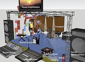 Live event support includes staging, scenery, mechanicals, sound, lighting, video, special effects, transport, packaging, communications, costume and makeup for live performance events including theater, music, dance, and opera. They all share the same goal: to convince live audience members that there is no better place that they could be at the moment. This is achieved through establishing a bond between performer and audience.[1] Live performance events tend to use visual scenery, lighting, costume amplification and a shorter history of visual projection and sound amplification reinforcement.[2]
