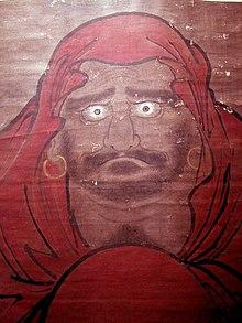 According to the principal Chinese sources, Bodhidharma came from the Western Regions,[5][6] which refers to Central Asia but may also include the Indian subcontinent, and is described as either a "Persian Central Asian"[5] or a "South Indian [...] the third son of a great Indian king."[6][note 2] Throughout Buddhist art, Bodhidharma is depicted as an ill-tempered, profusely-bearded, wide-eyed non-Chinese person. He is referred as "The Blue-Eyed Barbarian" (Chinese: 碧眼胡; pinyin: Bìyǎnhú) in Chan texts.[11]