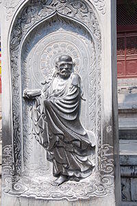 Bodhidharma was a semi-legendary Buddhist monk who lived during the 5th or 6th century. He is traditionally credited as the transmitter of Chan Buddhism to China, and regarded as its first Chinese patriarch. According to Chinese legend, he also began the physical training of the monks of Shaolin Monastery that led to the creation of Shaolin kungfu. In Japan, he is known as Daruma. His name means "dharma of awakening (bodhi)" in Sanskrit.[1]