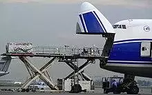The 747-8 Freighter, or 747-8F, is derived from the 747-400ERF. The variant has 16% more payload capacity than its predecessor, allowing it to carry seven more standard air cargo containers, with a maximum payload capacity of 154 tons (140 tonnes) of cargo.[199] As on previous 747 freighters, the 747-8F features an overhead nose-door and a side-door on the main deck plus a side-door on the lower deck ("belly") to aid loading and unloading. The 747-8F made its maiden flight on February 8, 2010.[200][201] The variant received its amended type certificate jointly from the FAA and the European Aviation Safety Agency (EASA) on August 19, 2011.[202] The -8F was first delivered to Cargolux on October 12, 2011.[203]