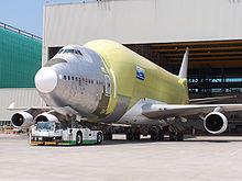 The LCF conversion was partially designed by Boeing's Moscow bureau and Boeing Rocketdyne with the swing tail designed in partnership with Gamesa Aeronáutica of Spain.[6] The cargo portion of the aircraft is unpressurized. [7] Modifications were carried out in Taiwan by Evergreen Aviation Technologies Corporation,[2] a joint venture of Evergreen Group's EVA Air and General Electric.[8] Boeing reacquired the four 747-400s; one former Air China aircraft,[9] two former China Airlines aircraft,[10][11] and one former Malaysia Airlines aircraft.[12]