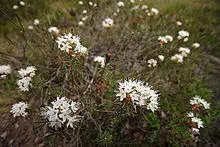 There are many highly specialized animals, fungi, and plants associated with bog habitat. Most are capable of tolerating the combination of low nutrient levels and waterlogging.[1](chapter 3) Sphagnum is generally abundant, along with ericaceous shrubs. The shrubs are often evergreen, which may assist in conservation of nutrients.[11] In drier locations, evergreen trees can occur, in which case the bog blends into the surrounding expanses of boreal evergreen forest.[12] Sedges are one of the more common herbaceous species. Carnivorous plants such as sundews (Drosera) and pitcher plants (for example Sarracenia purpurea) have adapted to the low-nutrient conditions by using invertebrates as a nutrient source. Orchids have adapted to these conditions through the use of mycorrhizal fungi to extract nutrients.[1]:88 Some shrubs such as Myrica gale (bog myrtle) have root nodules in which nitrogen fixation occurs, thereby providing another supplemental source of nitrogen.[13]