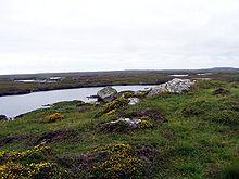 In cool climates with consistently high rainfall (on more than c. 235 days a year), the ground surface may remain waterlogged for much of the time, providing conditions for the development of bog vegetation. In these circumstances, bog develops as a layer "blanketing" much of the land, including hilltops and slopes.[18] Although a blanket bog is more common on acidic substrates, under some conditions it may also develop on neutral or even alkaline ones, if abundant acidic rainwater predominates over the groundwater. A blanket bog cannot occur in drier or warmer climates, because under those conditions hilltops and sloping ground dry out too often for peat to form – in intermediate climates a blanket bog may be limited to areas which are shaded from direct sunshine. In periglacial climates a patterned form of blanket bog may occur, known as a string bog. In Europe, these mostly very thin peat layers without significant surface structures are distributed over the hills and valleys of Ireland, Scotland, England and Norway. In North America, blanket bogs occur predominantly in Canada east of Hudson Bay. These bogs are often still under the influence of mineral soil water (groundwater). Blanket bogs do not occur north of the 65th latitude in the northern hemisphere.