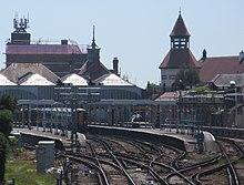 The site of the present station dates from the opening of the branch line to Bognor from Barnham on 1 June 1864, after several abortive projects to connect the town to the railway system in 1845, 1853 and 1855. The station suffered two disasters in the 1890s, when it was blown down in a gale in 1897, and then burned down in 1899.[3] The present station buildings by the company architect C.D. Collins[4] date from 1902 and have achieved grade II listed building status[1] as an Edwardian period seaside station terminus .[5][6]