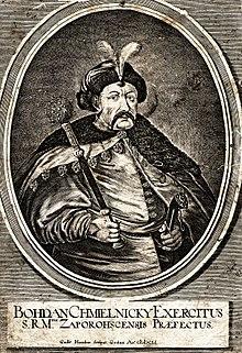 Zynoviy Bohdan Khmelnytsky (Ruthenian: Ѕѣнові Богдан Хмелнiцкiи;[1] modern Ukrainian: Богдан Зиновій Михайлович Хмельницький; c. 1595 – 6 August 1657) was a Ukrainian[2][3][4][5][6][7][8] Hetman of the Zaporozhian Host, then in the Polish Crown of the Polish–Lithuanian Commonwealth (now part of Ukraine). He led an uprising against the Commonwealth and its magnates (1648–1654) that resulted in the creation of a state led by the Cossacks. In 1654, he concluded the Treaty of Pereyaslav with the Russian Tsardom and thus allied the Cossack Hetmanate with Russia.