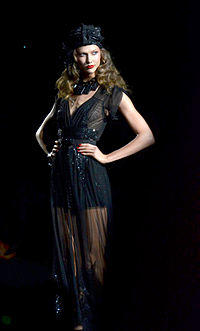 A "catwalk", a refinement in 2006, of which actresses Kate Bosworth and Thandie Newton were said to be exponents, was referred to as "cocktail grunge" – "looking done-undone ... it's what Marianne Faithfull and Blondie would be wearing if they were young now".[95] – while a journalist who interviewed supermodel Helena Christensen in 2011 observed that, fresh from a photoshoot, she "flopped in a leather armchair like a sexy, ageing beatnik" and that, while "not a hippie, exactly", she lived in "groovy bohemia in Manhattan, where you can spot [her] moseying around the flea markets on the weekends".[96] At the end of the 2000s (decade), this combination of apparently conflicting features was adopted by teenaged actress Taylor Momsen, who, in 2010, became the "face" of the British retailing chain New Look. Momsen described her style as "sweet and tough, grunge meets Chanel – a giant oxymoron" and claimed that she chose her outfits from "whatever clean clothes she finds on her floor" ("although no one ever believes me").[97]